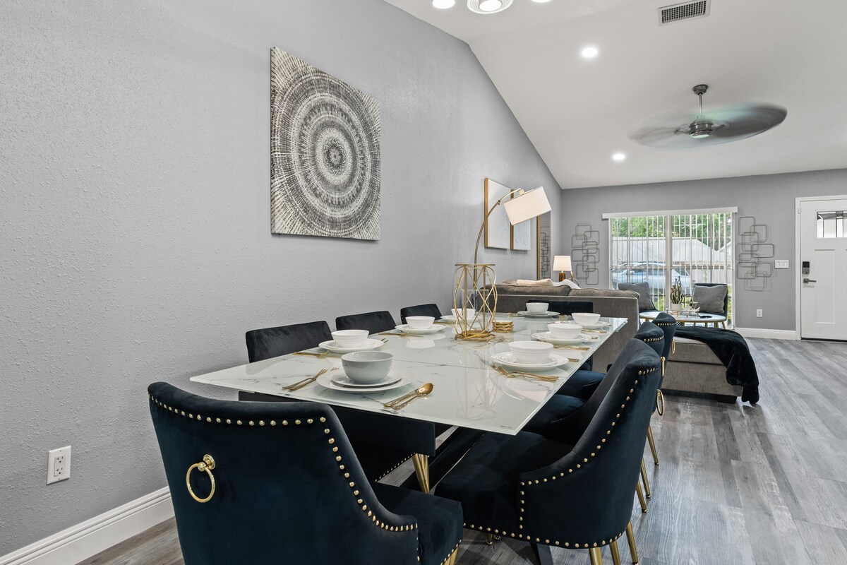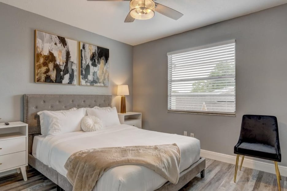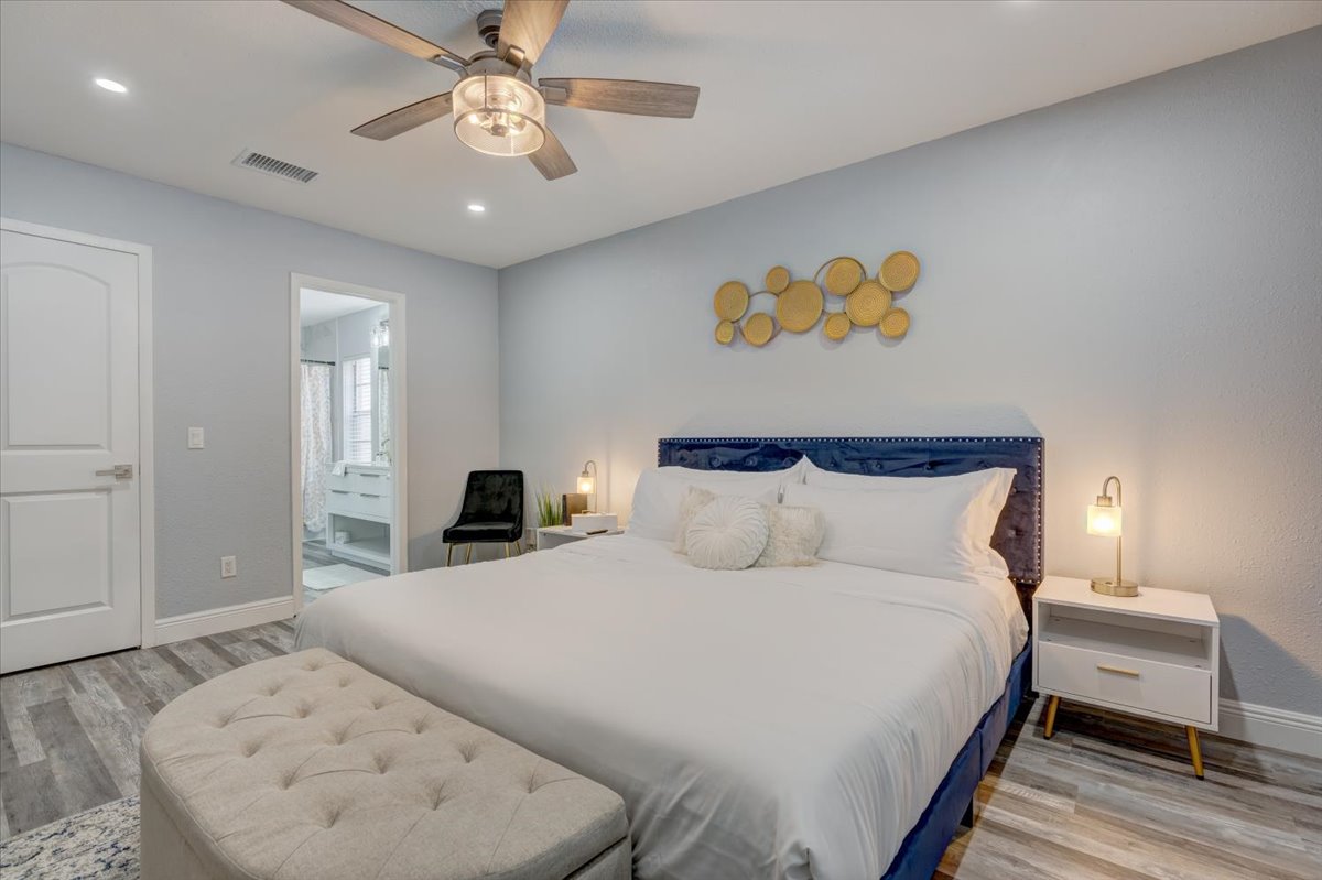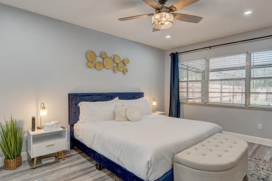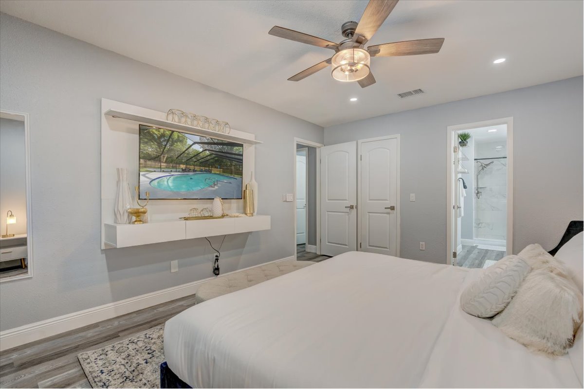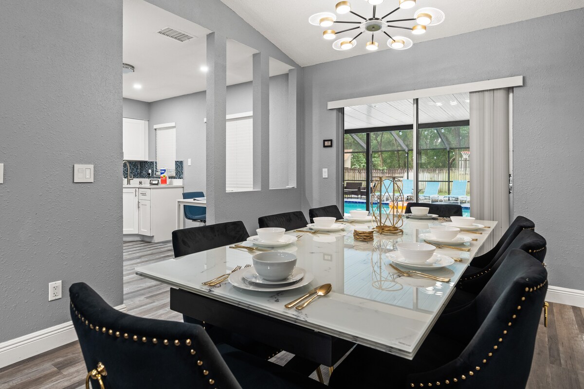 Step into our stunning ultra-modern interior, where contemporary décor and updated furnishings await you. The sleek lines and minimalist design of our Tampa vacation rental create a sophisticated ambiance that’s perfect for relaxation and entertaining. Hardwood floors lead you through the open concept living area, where natural light floods the space and accentuates the clean, crisp lines of our home’s architecture.