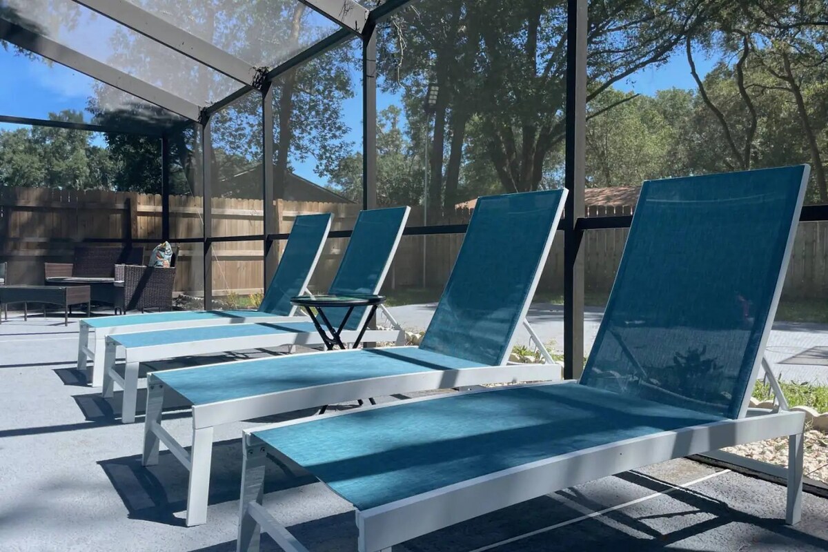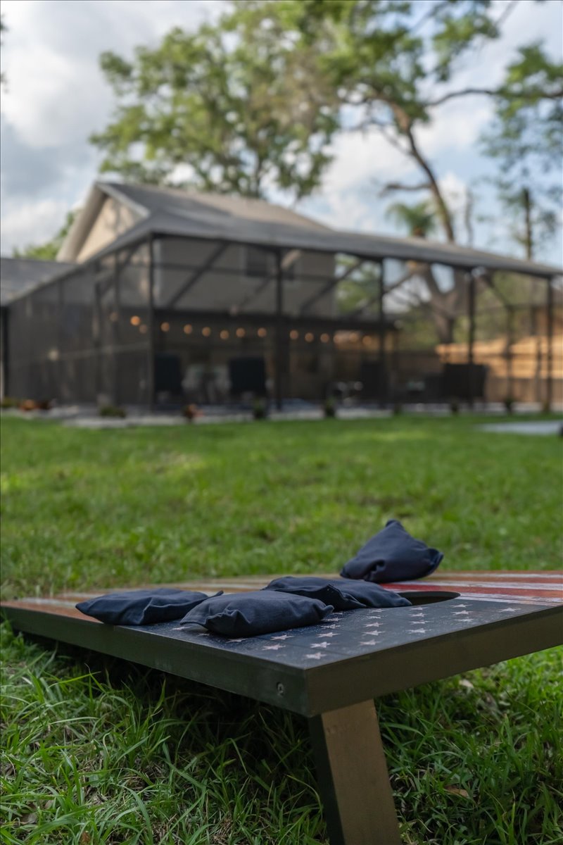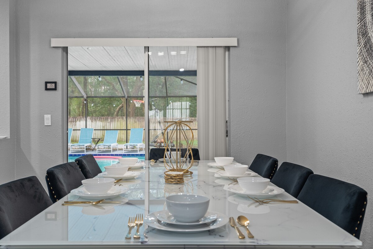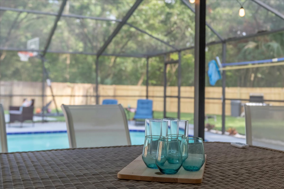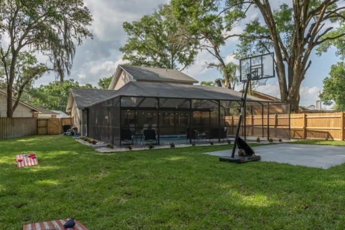 Escape to your own private oasis in our lush backyard, where you’ll find a paradise awaiting you. Lounge by the sparkling pool with a good book, or gather with loved ones for an al fresco meal in the outdoor dining area. Sip on cocktails in the shade of the lanai, or soak up the Florida sunshine on the comfortable loungers. Even play a game of basketball on the sports court. Our expansive backyard is surrounded by tropical foliage and offers the perfect backdrop for relaxation and rejuvenation. This is the ultimate outdoor sanctuary, and we can’t wait for you to experience it.